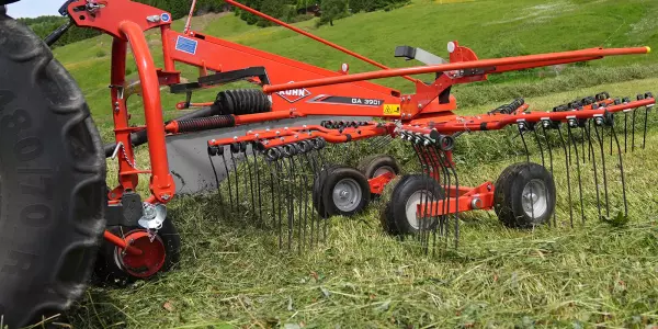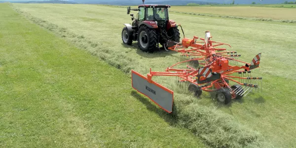KUHN's rake design is well adapted to harvesting and preserving the quality and nutritional value of the forage. Single-rotor rakes are a simple and effective swathing solution. The KUHN range offers models in mounted or trailed versions, with working widths from 3.20 m to 5.00 m.