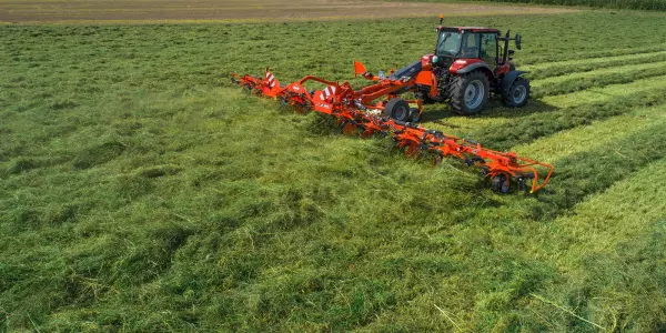 Simple and efficient, the new KUHN GF 13003 T tedder is ideal for satisfying demanding users. With a working width of 13 m, its work rate is impressive. This tedder offers an exceptional quality of work