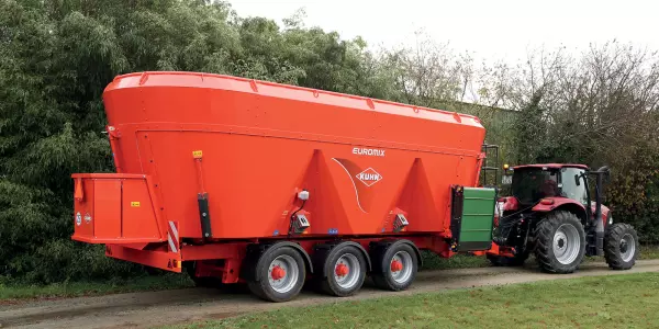 EUROMIX mixer with 3 stainless steel vertical augers, lateral distribution and large hopper. Available in 28, 33, 39 and 45 m3 capacities, for herds of between 140 and 360 cattle, depending on the ration per mix.